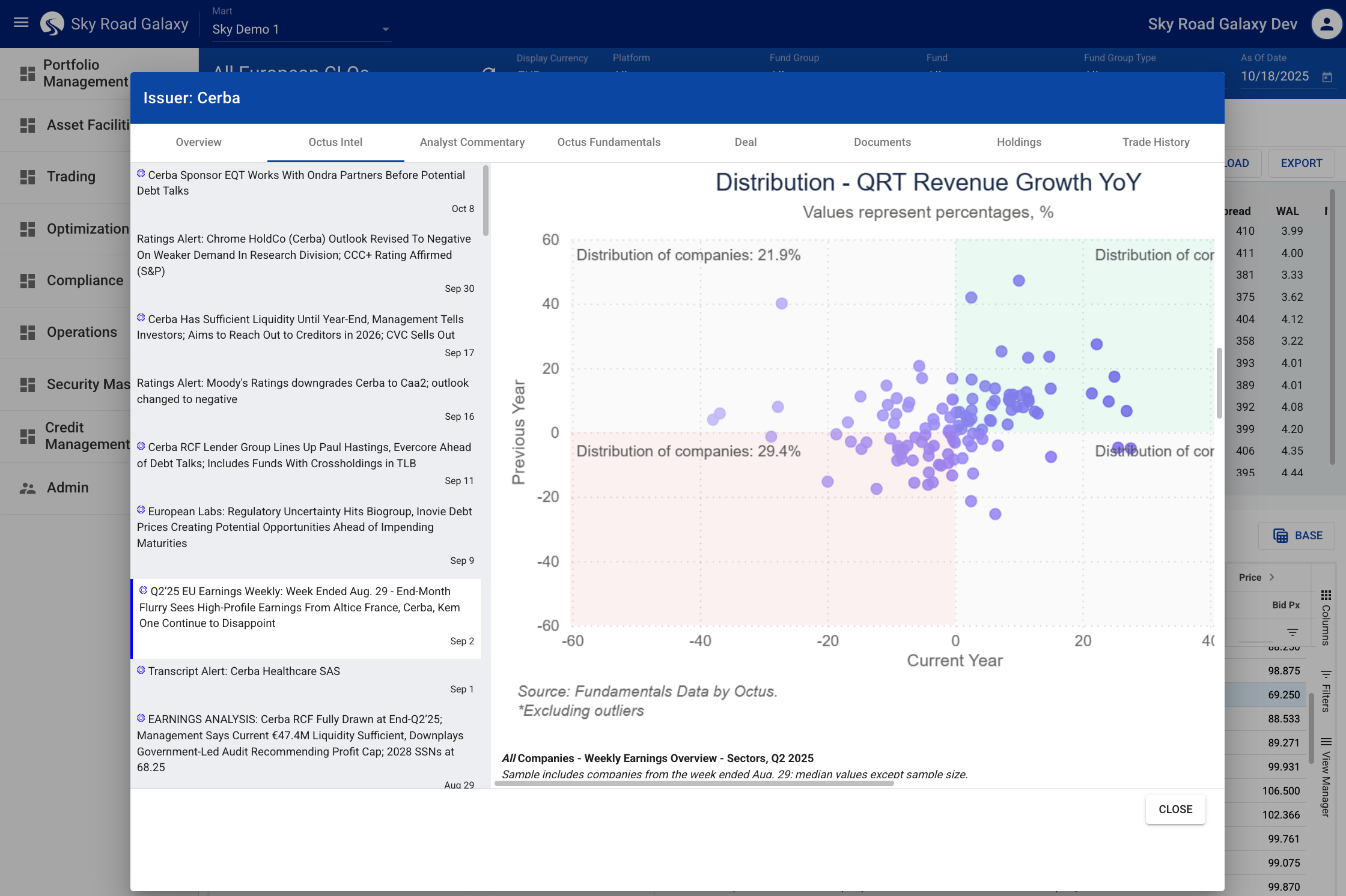 Sky Road, the credit portfolio management solution from Octus, offers investors exceptional usability and performance for managing all types of credit vehicles and strategies, by integrating portfolio management, optimization, compliance, trade order management and research management workflows.