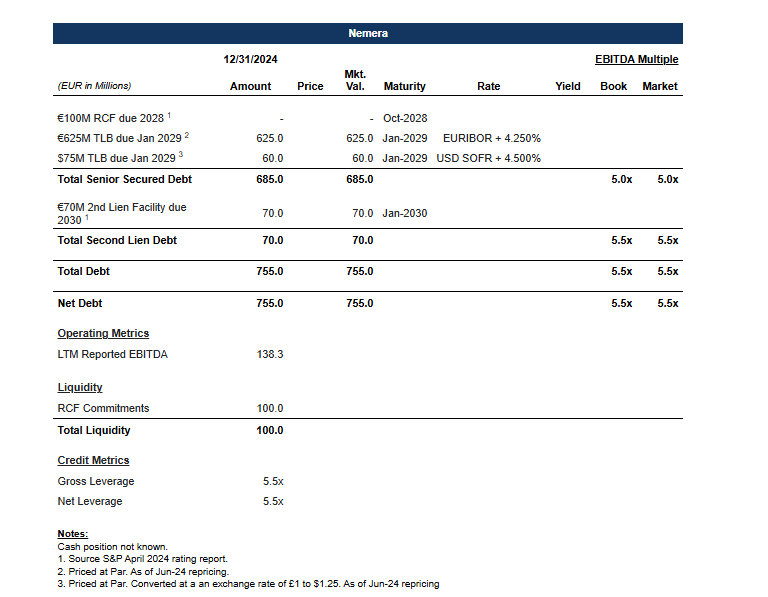 In June 2024, Nemera allocated a €625 million term loan B repriced at par with E+425 bps margin and a $75 million at par with S+450 bps, as reported. Physical bookrunners for the deal included HSBC and Natixis.