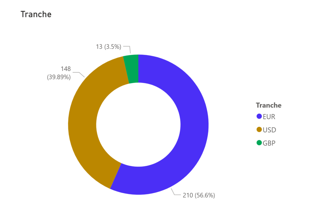 Euro-denominated transactions accounted for 56.5% of the dataset versus 39.8% of U.S. dollar, again influenced by the coverage focus rather than underlying market size.