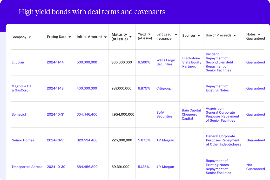 Get rapidly up to speed on new opportunities and situations, so you’re ready for pitches, client meetings, and negotiations. Track sponsors, advisors and competitors. Find what you need fast with accessible datasets sourced from court filings, financials, and bond or loan documents.